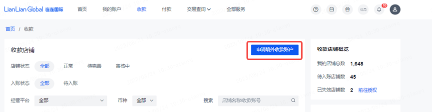 如需要查看对应收款账户及店铺信息,可在连连首页,点击“查看全部店铺”
