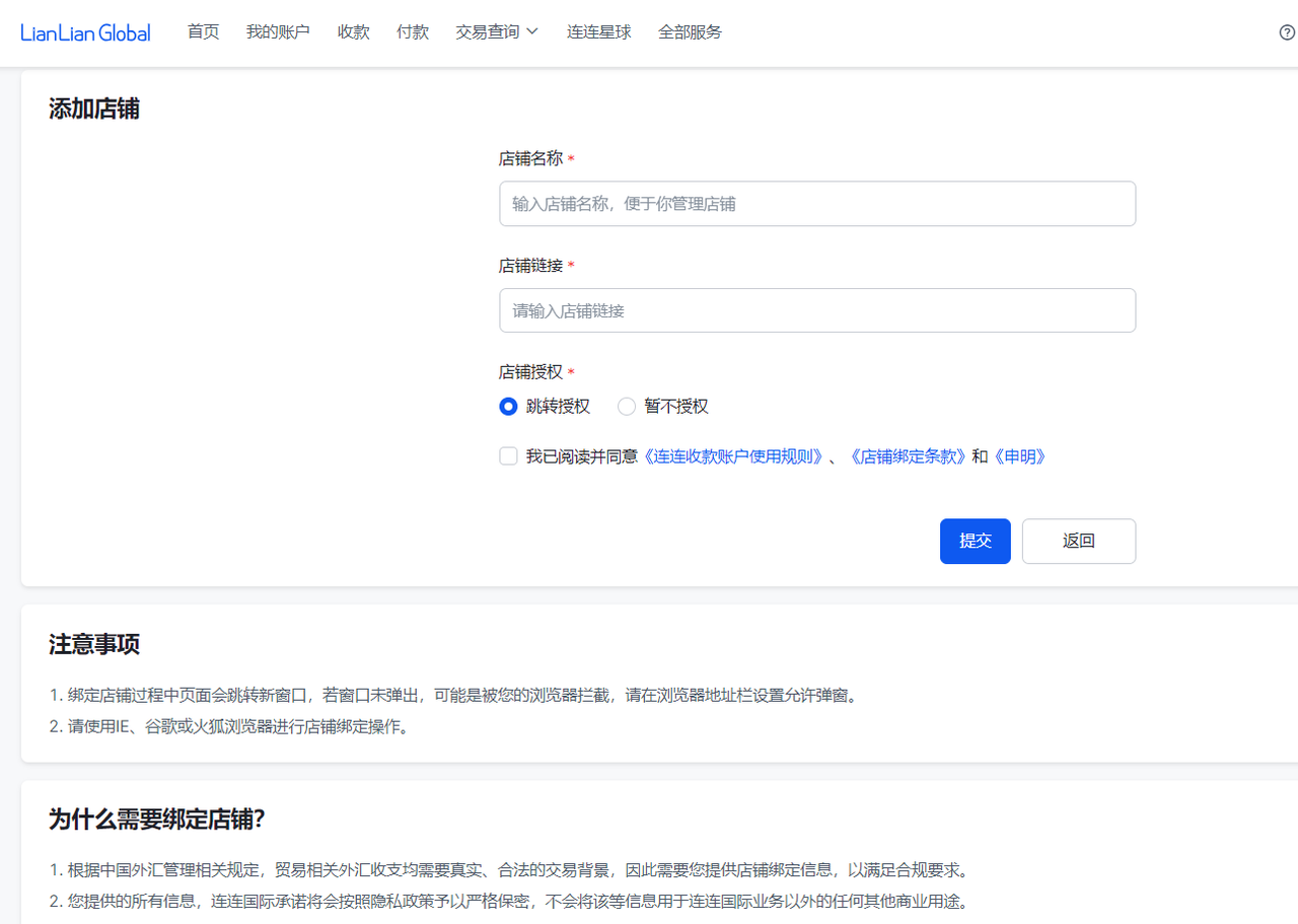 提交后,需要在店铺详情页添加子店铺:点击【添加店铺】然后进行跳转授权,可以授权多个店铺,自动获取该店铺贸易材料,通常在T+1日生成入账额度。
