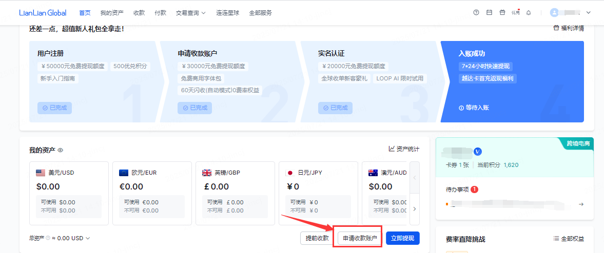 请您点击用户站登录连连国际账户,点击【申请收款账户】。