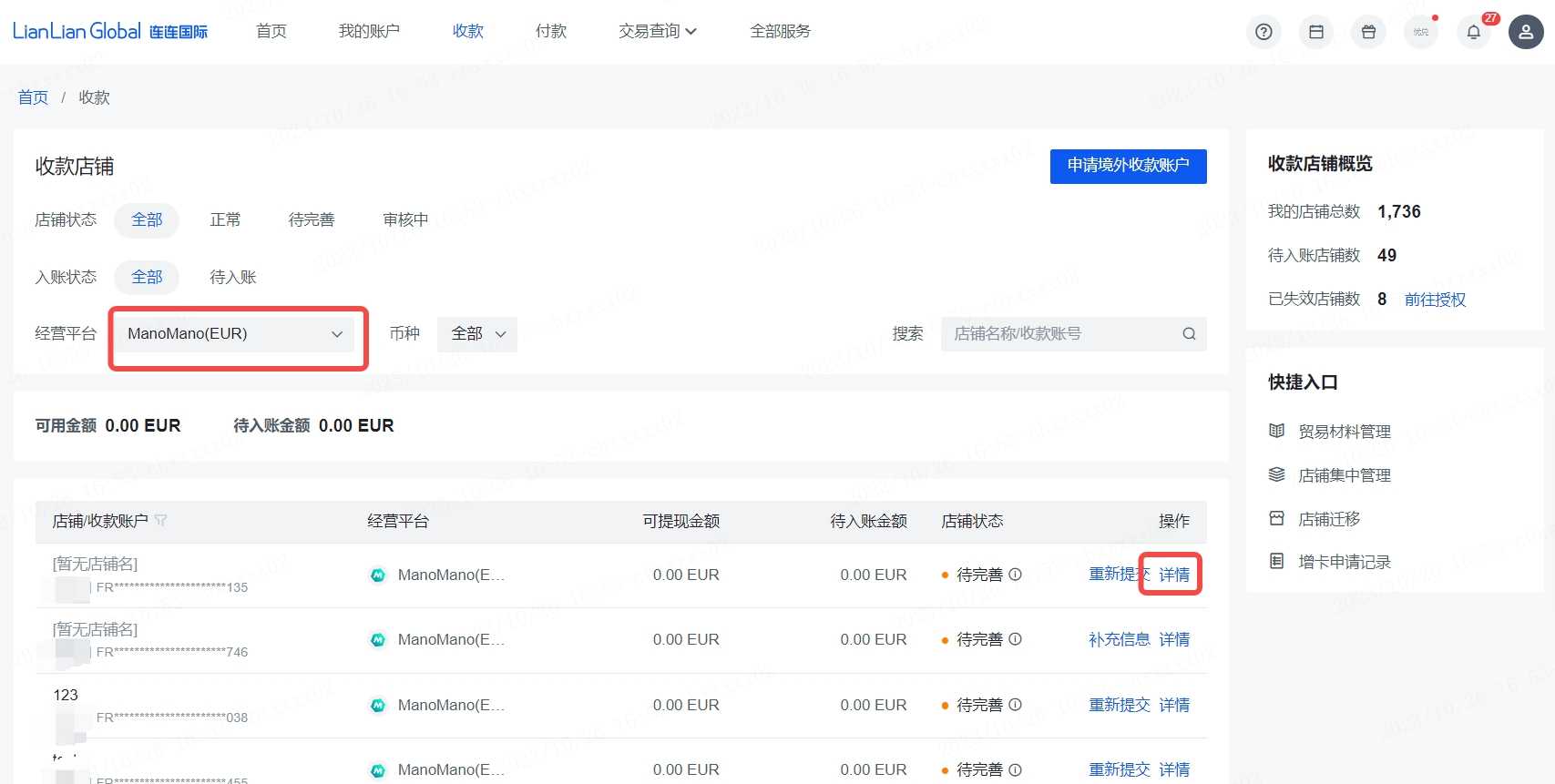 点击【收款】-选择对应的经营平台,【ManoMano(GBP)】或【ManoMano(EUR)】-点击【详情】,复制银行账户信息。