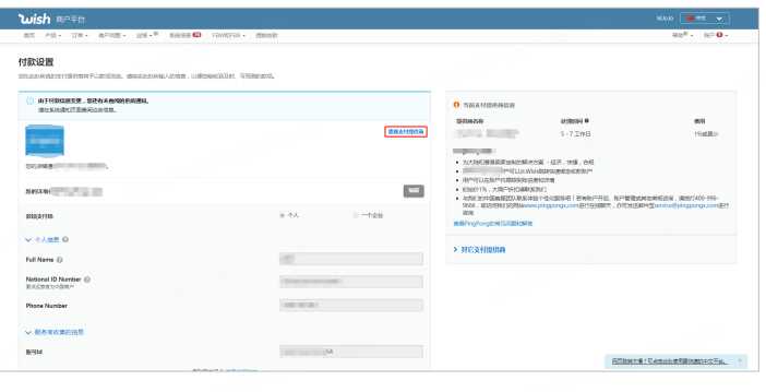 登录 wish 后台,右上角选择【账户】-【付款设置】