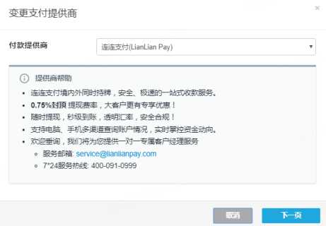 若店铺未设置过任何支付提供商,则在页面左侧支付信息中选择提供商为“LianLian Pay, 若店铺已设置过 其他的支付提供商,则选择更换支付提供商