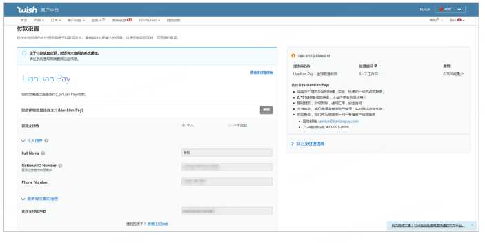 在连连绑定成功后页面跳转回到 Wish 后台,页面显示已选择连连作为支付提供商