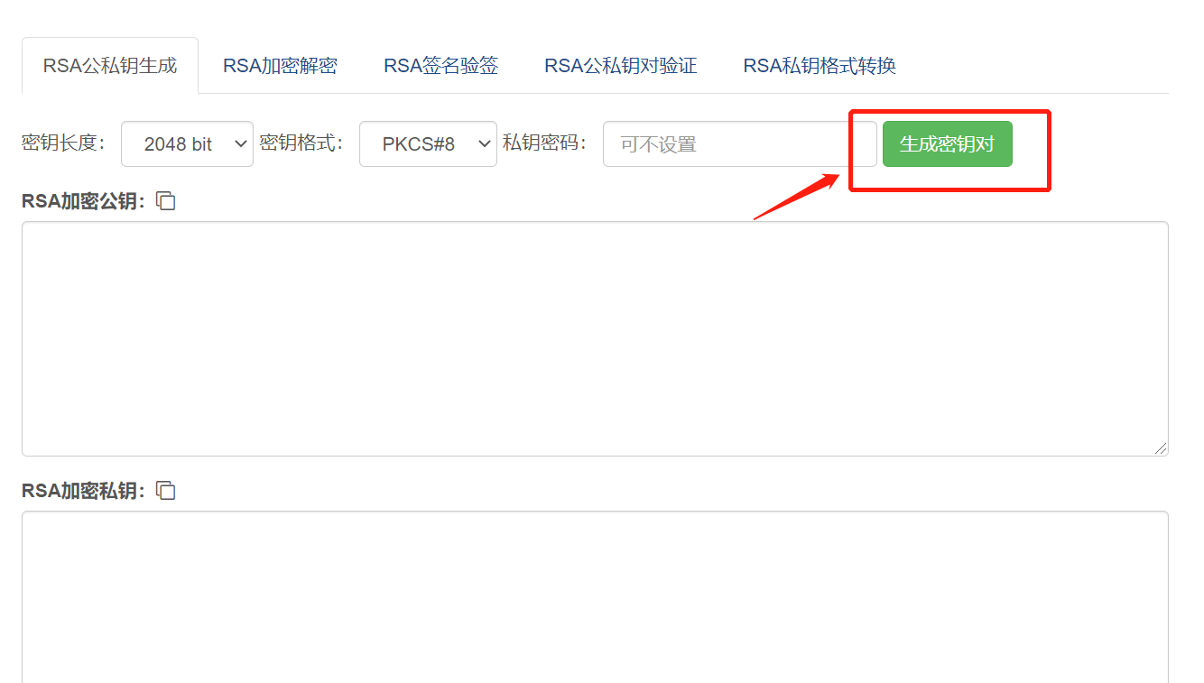1、商户公私钥生成:点击打开生成网站 (该网站仅用于举例,也可以选择其他工具生成),选择 RSA公私钥生成,确保密钥长度是 2048 bit,密钥格式为PKCS#8,点击生成密钥对。