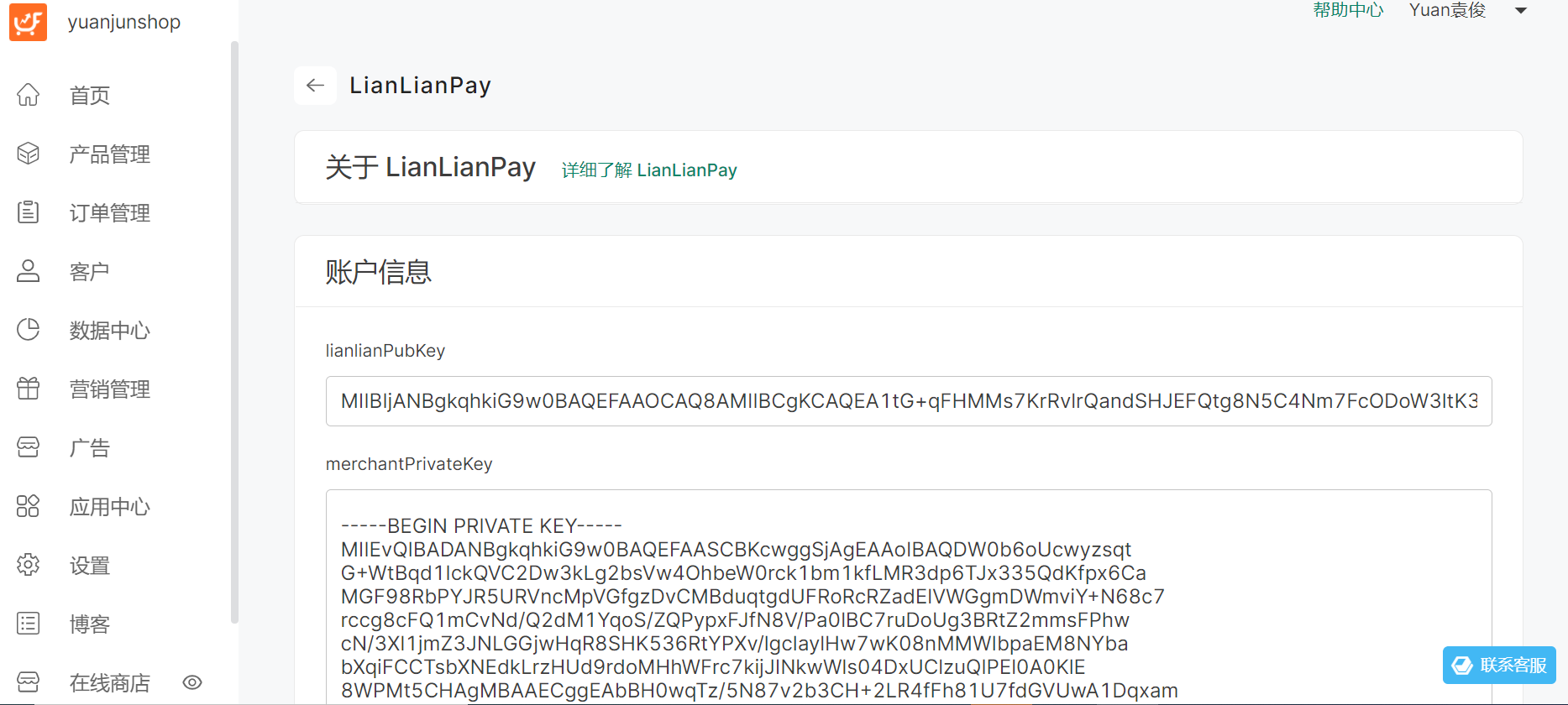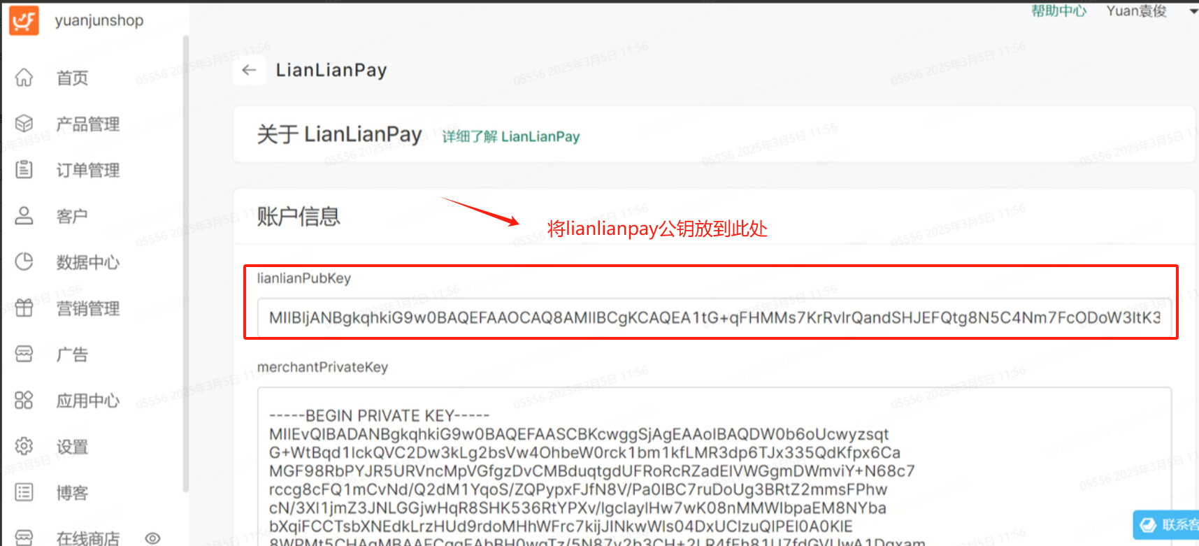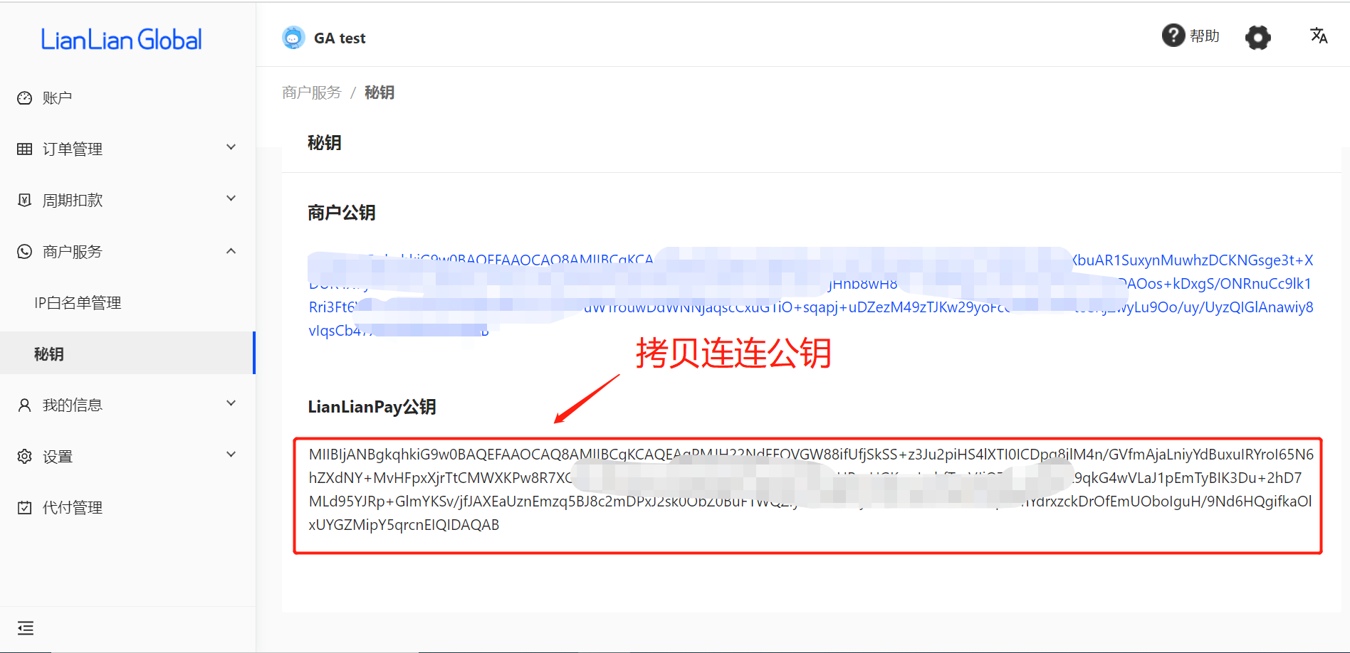 5、在连连全球收单商户站后台获取【lianlianpay公钥】,复制到FunPinPin后台lianlianPubKey