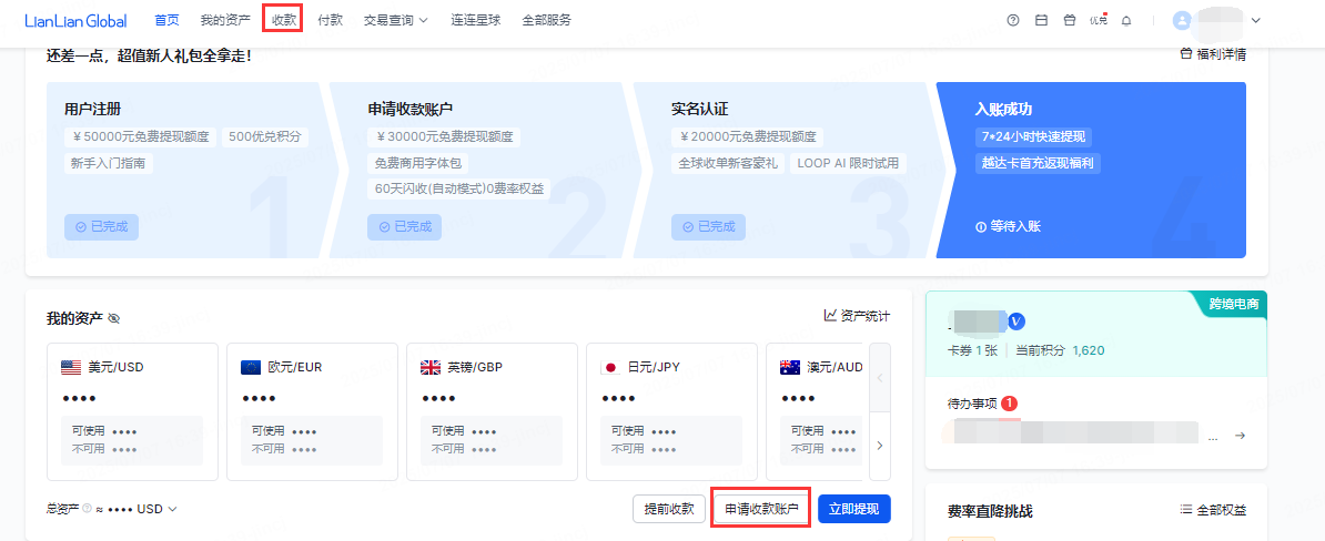 请您点击用户站登录连连国际账户,点击【申请收款账户】。
