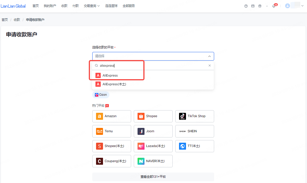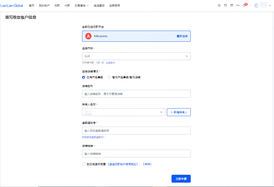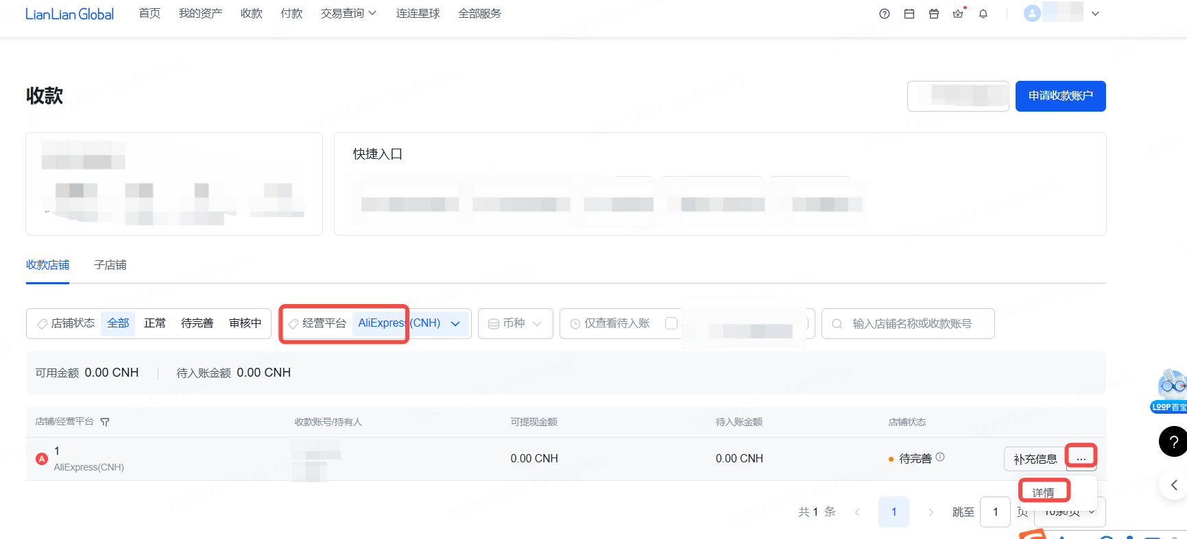 进入连连首页——【收款】,选择AliExpress对应的经营平台后,可点击【详情】查看银行账号