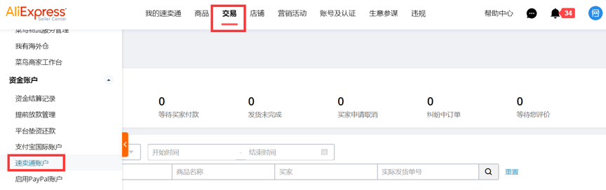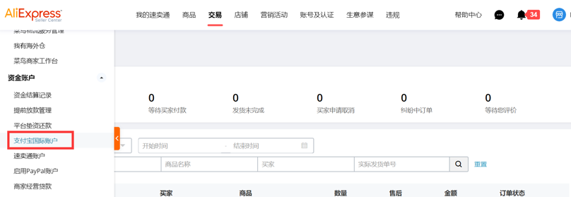登录速卖通后台,点击【交易】——【资金账户管理】——【支付宝国际账户】