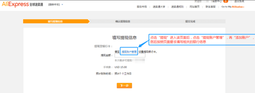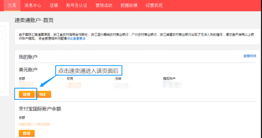 点击 【速卖通账户】后进入 【提现】