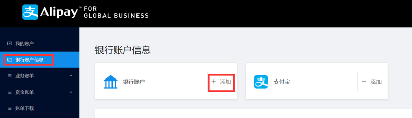 进入支付宝国际账号,银行账户信息——选择【银行账户】,点击【添加】