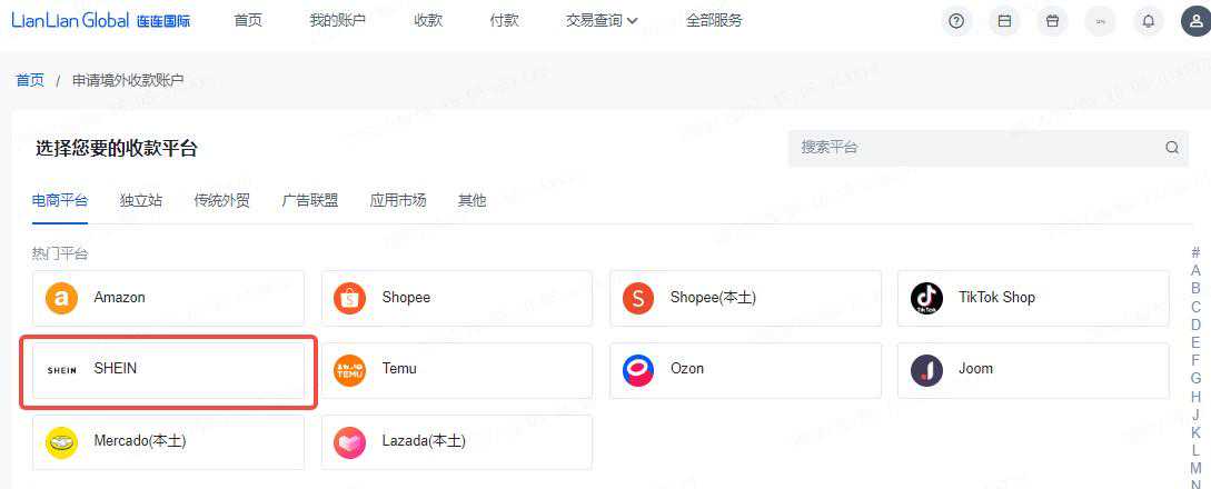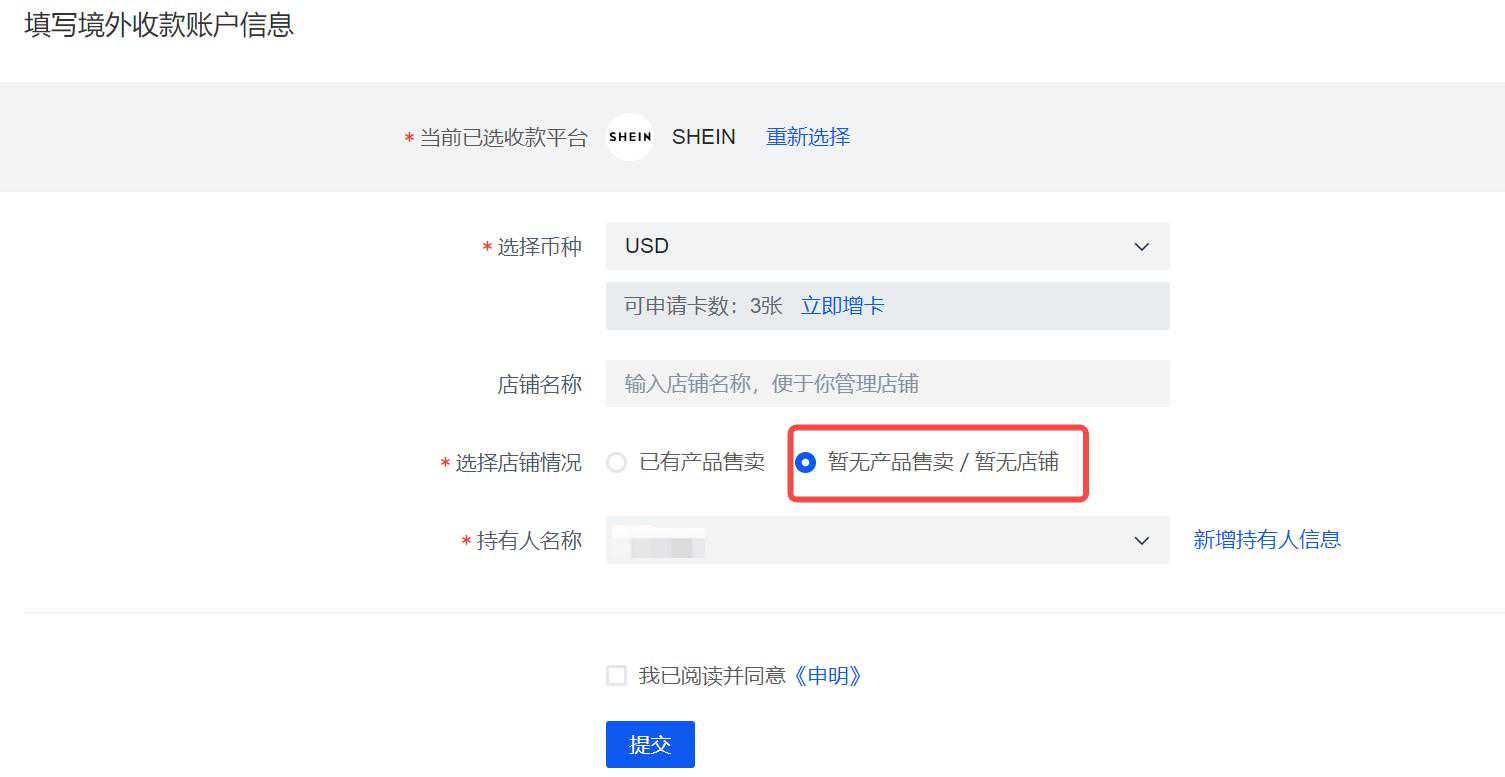 选择【SHEIN】→【暂无店铺】→ 【提交】, 即完成账号申请