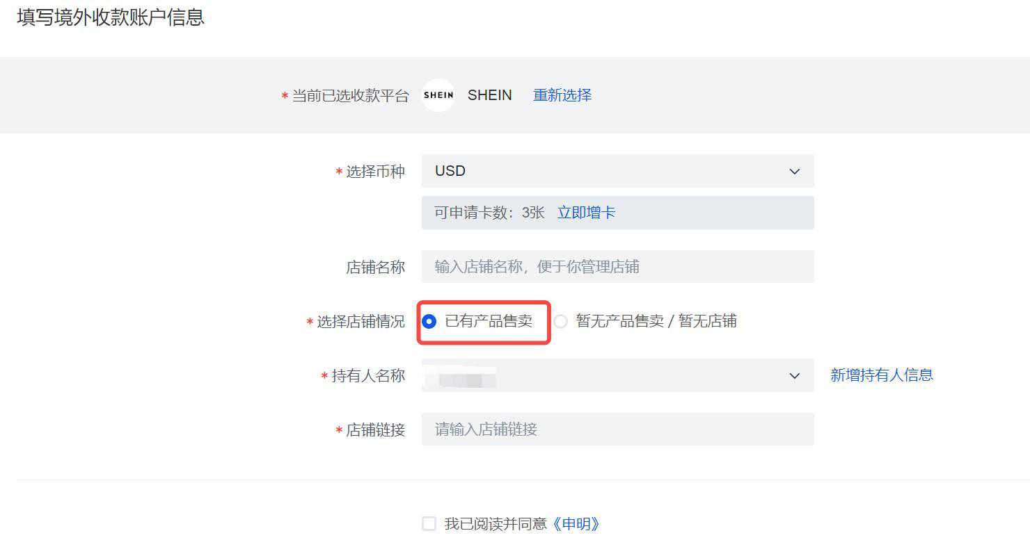 如已有店铺,可选择【已有产品售卖】并填写店铺相关信息,店铺链接,即可完成账号申请。