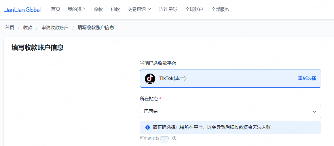 巴西持有人审核通过后,申请收款账户时可以添加该持有人。
