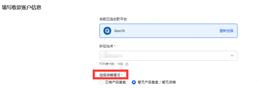 如您的Qoo10店铺是新开的,未上架产品,请选择【暂无产品售卖/暂无店铺】申请收款账户。