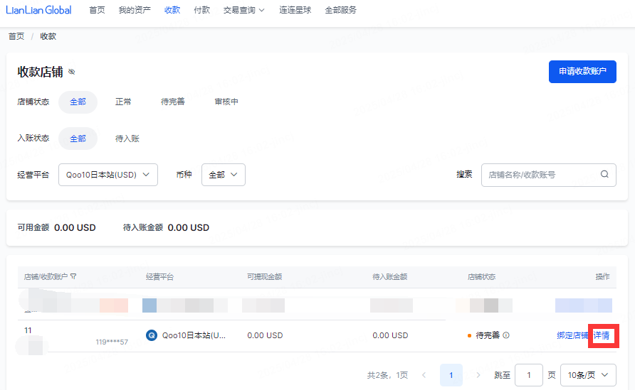 点击【收款】-选择对应的经营平台,【Qoo10日本站】-点击【详情】,复制银行账户信息。