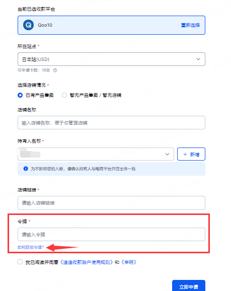在连连绑定Qoo10日本站店铺时,需输入令牌。令牌获取方式可点击页面超链接“如何获取令牌”;