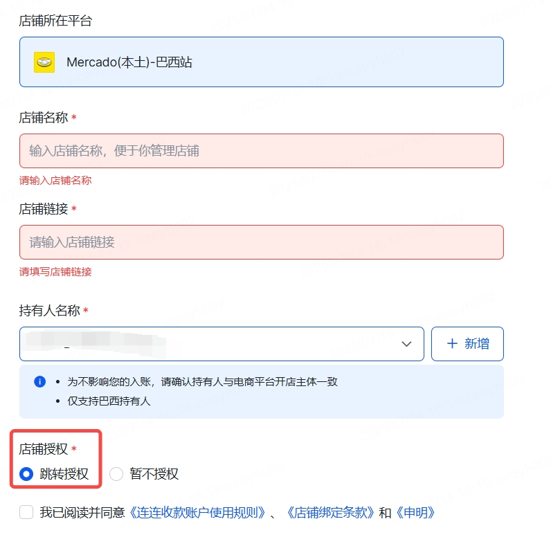 申请巴西本土收款账户,必须选择巴西本地持有人。一个持有人对应一个店铺。