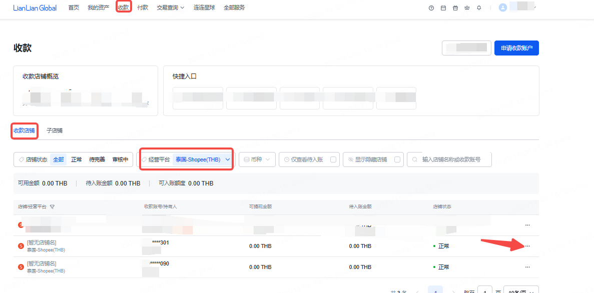 进入连连首页——【收款】,在经营平台中选择对应平台-选择对应店铺,点击“详情”