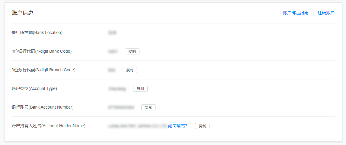 1.亚马逊日本站,不同收款账户对应的持有人信息是不同的,请参考下图位置,在连连国际后台「账号详情」页面,复制账户信息-账户持有人内容,填写到日本站后台。(注意:请勿使用浏览器提供的「自动填写」功能,浏览器的信息不准确的,实际信息以「账号详情」页面展示为准)