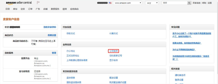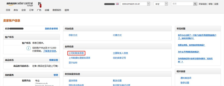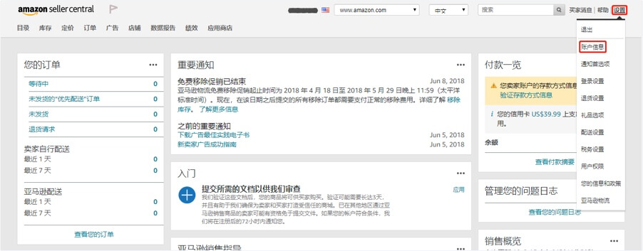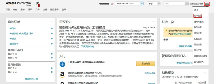 1.登录亚马逊卖家中心后台,点击右上角的“设置”—“账户信息”,进入账户信息界面。