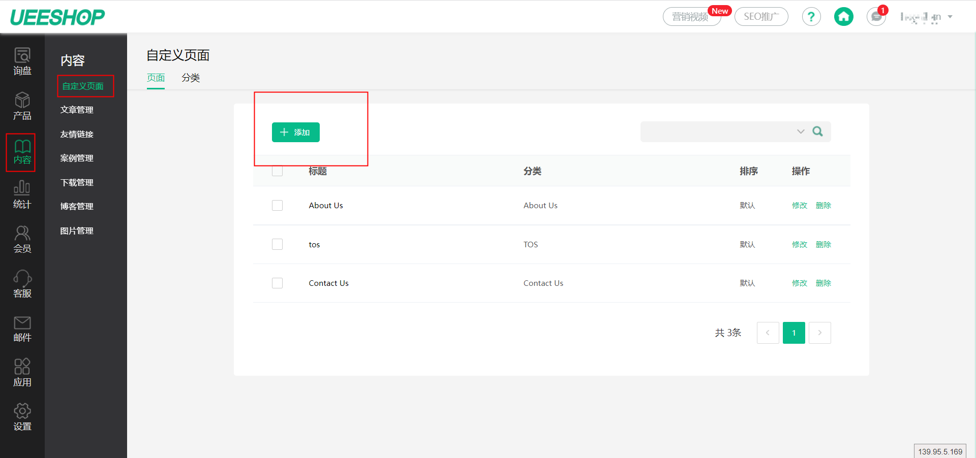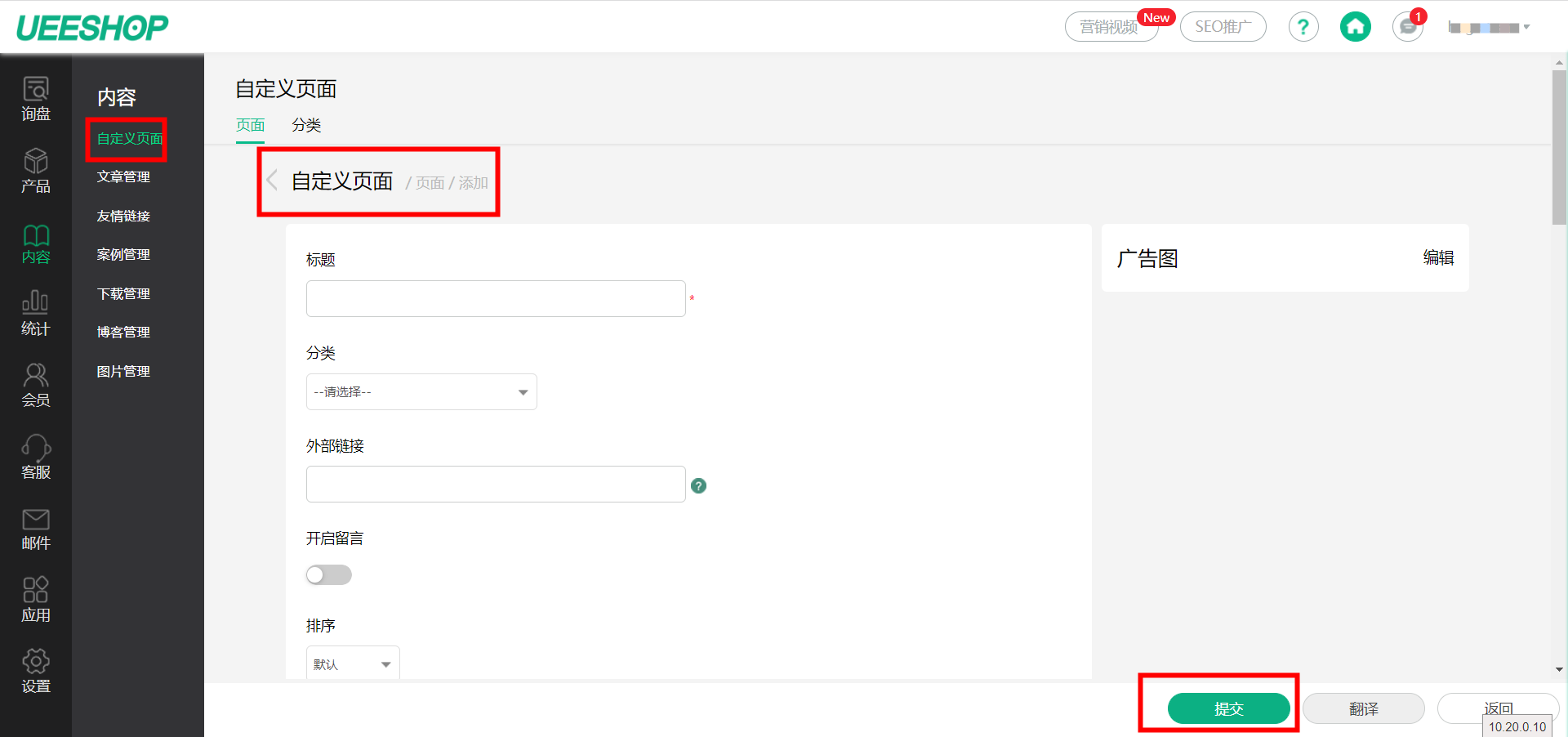 请您登录您的Ueeshop后台,依次点击【内容】-【自定义】-【添加】,出现编辑文章界面,填写文章标题以及正文内容,编辑完毕后,点击提交即可