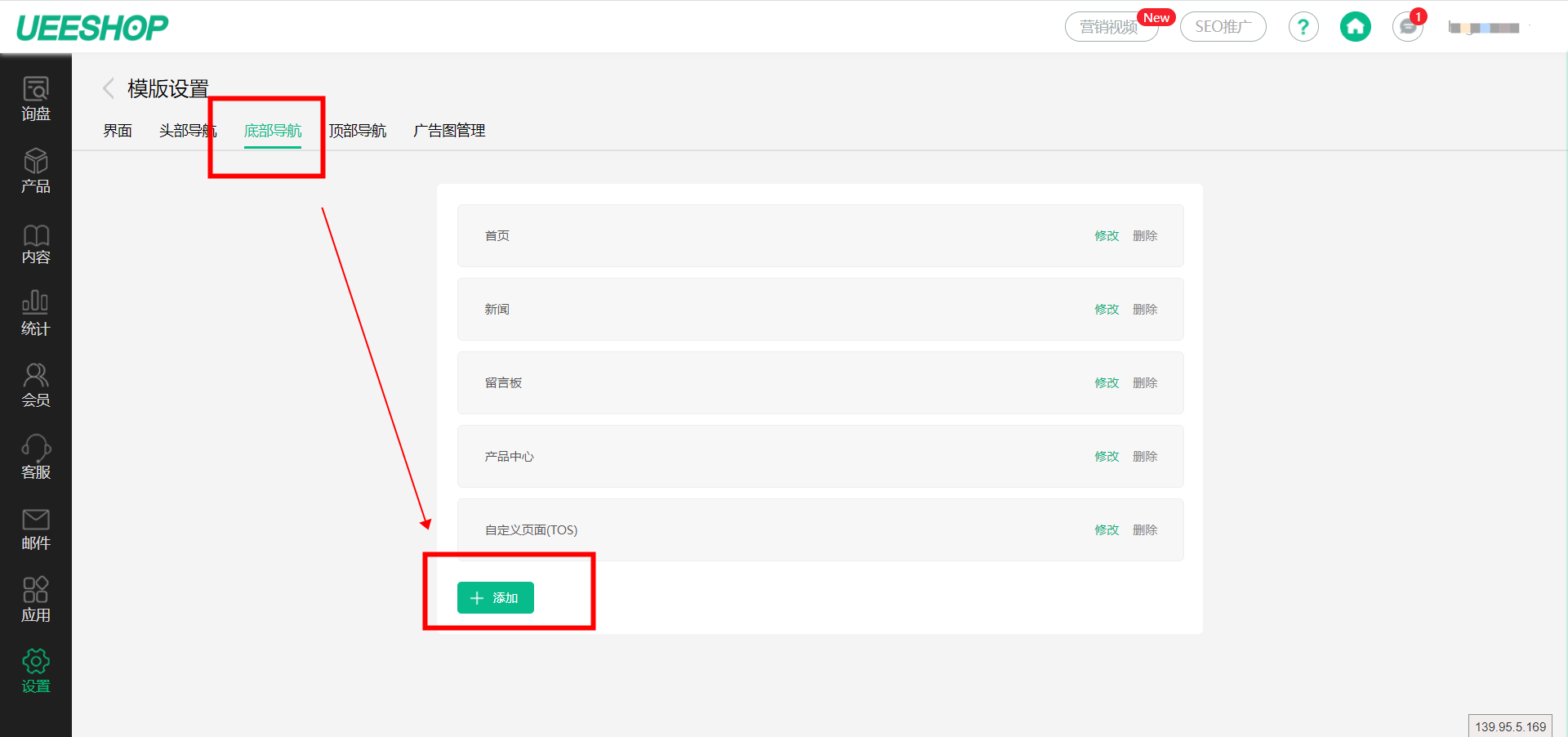 请您登录您的Ueeshop后台,依次点击【设置】-【模板设置】-【底部导航】出现添加界面,点击添加可选择需展示到网站页尾的文章