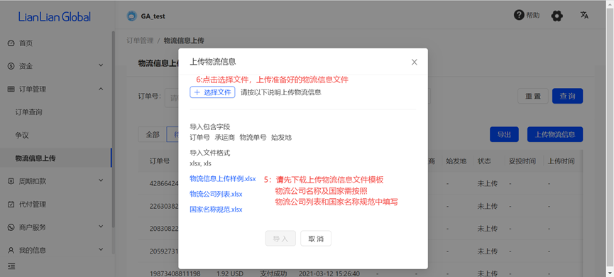 2、点击【上传物流信息】,先下载弹窗中的【物流信息上传模板】,按照模板格式填写。