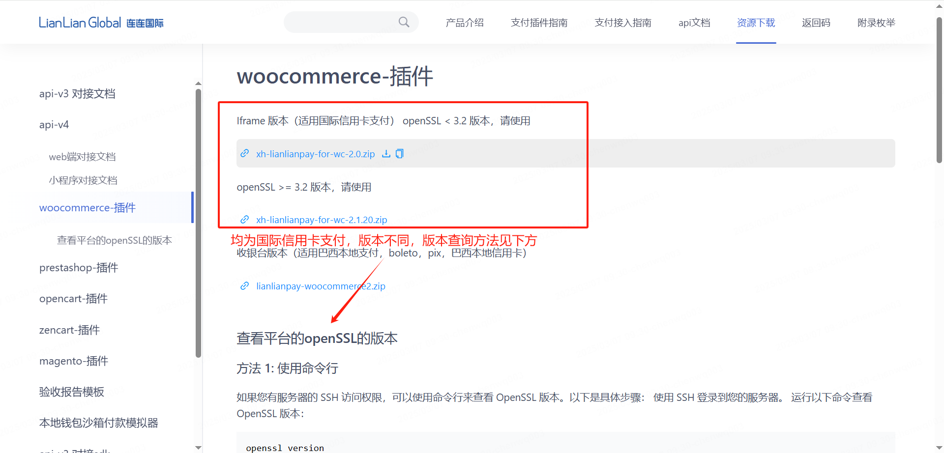 1、请点击LianLianPay WooCommerce插件>>下载最新插件 ,需先查看平台的openSSL版本(需要联系建站方技术进行查询),查询后下载对应版本的插件。