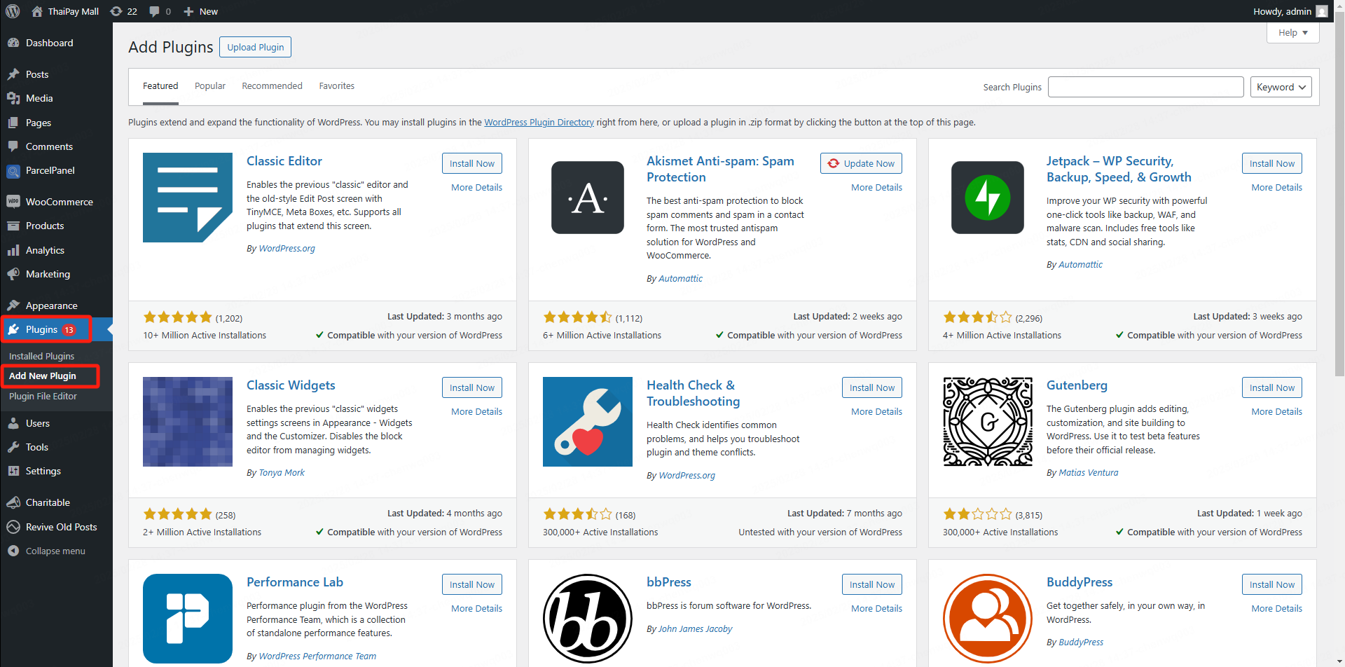 2、登录WooCommerce后台,点击菜单栏: 插件 (Plugins)> 安装新插件(Add New Plugin)