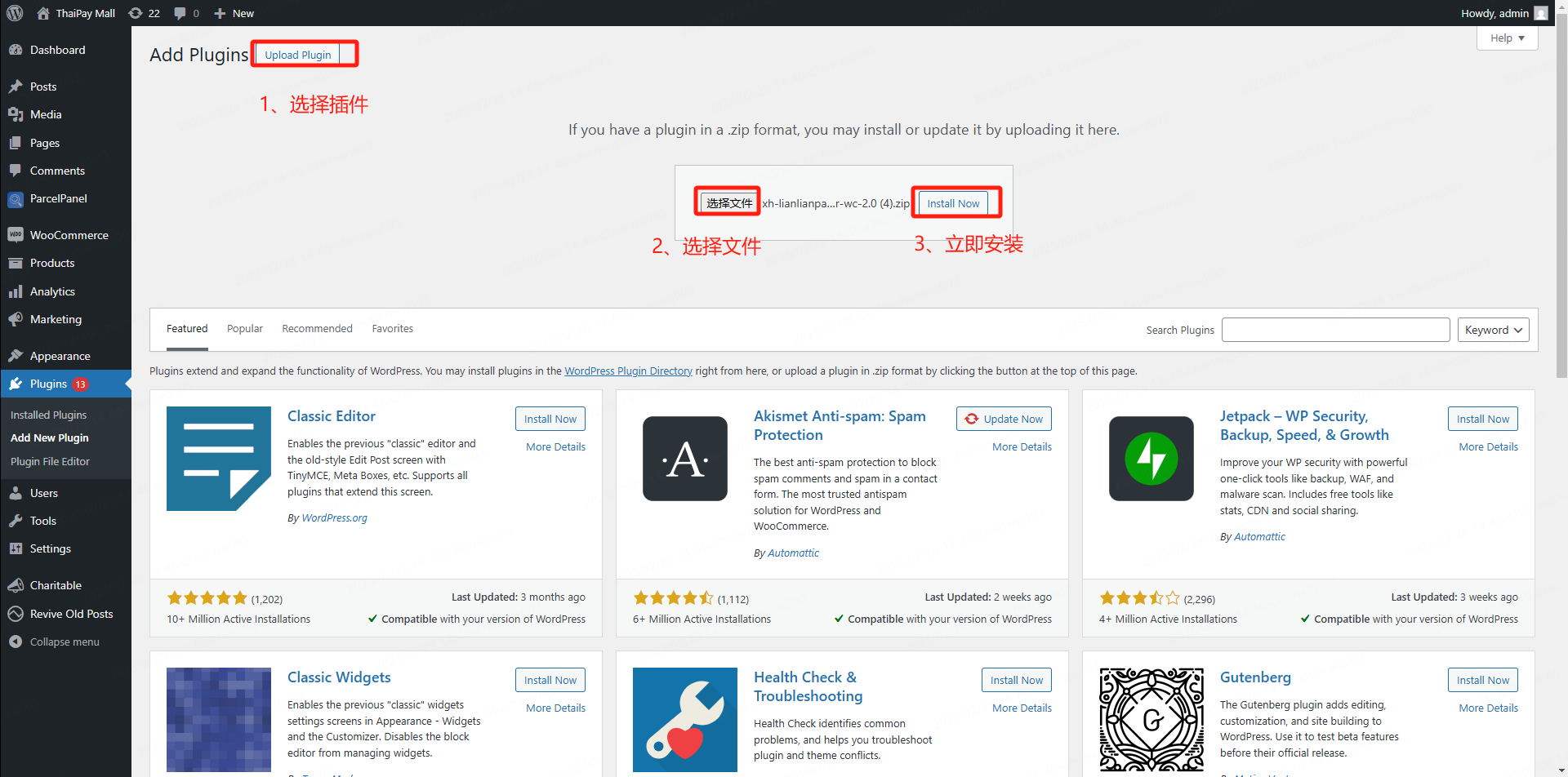 3、点击上传插件 (Upload Plugin) >选择文件(Choose File)> 选择刚刚下载的安装包 >立即安装(Install Now),然后点击 激活(Activate Plugin)