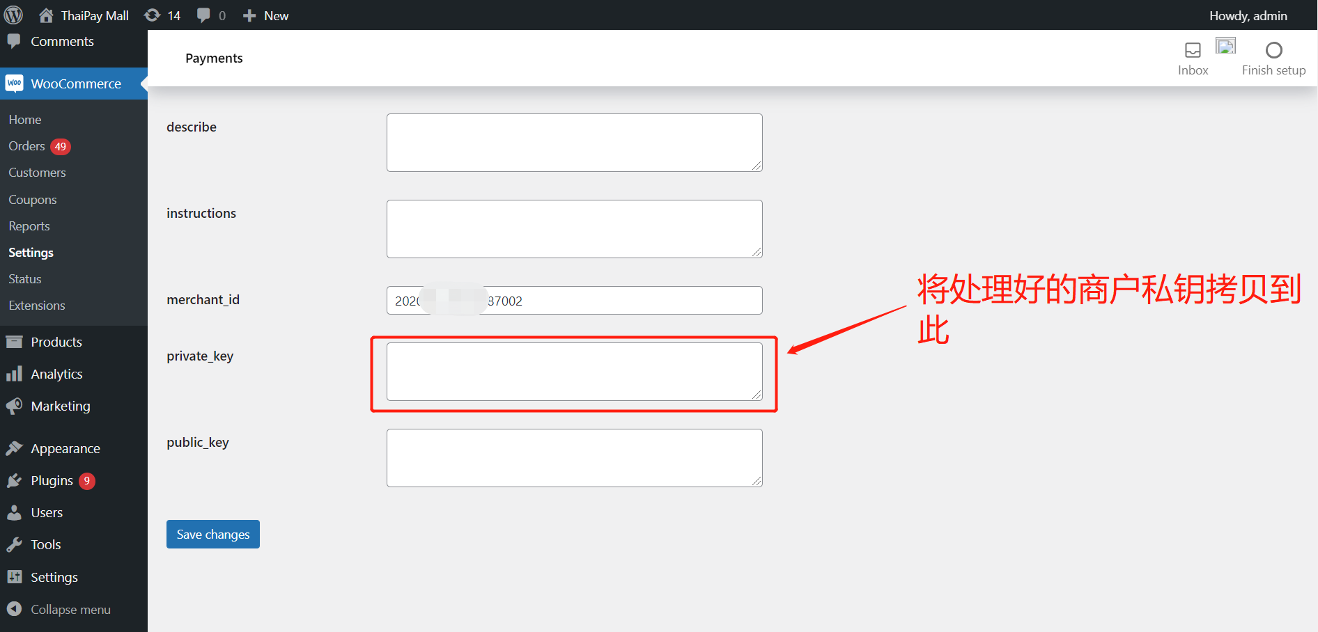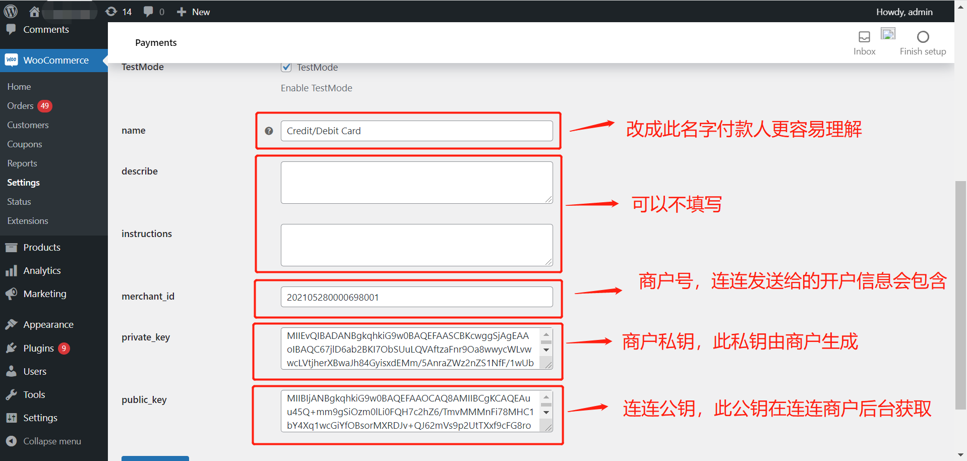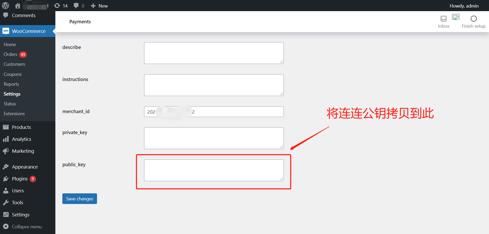 5、连连公钥配置:将连连全球收单商户站后台【开发者管理】-【密钥配置】中的LianLianPay公钥 复制到商户WooCommerce后台支付配置页面public_key中