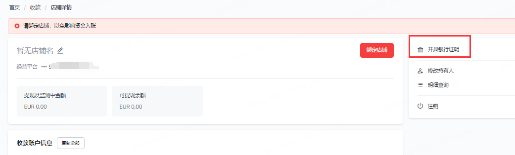 SHEIN澳洲站绑定收款账户时,需要提供银行证明。请在店铺详情页面右侧点击【开具银行证明】进行申请,审核成功后,可以在店铺详情页下载银行证明,用于SHEIN澳洲站店铺收款账户绑定。