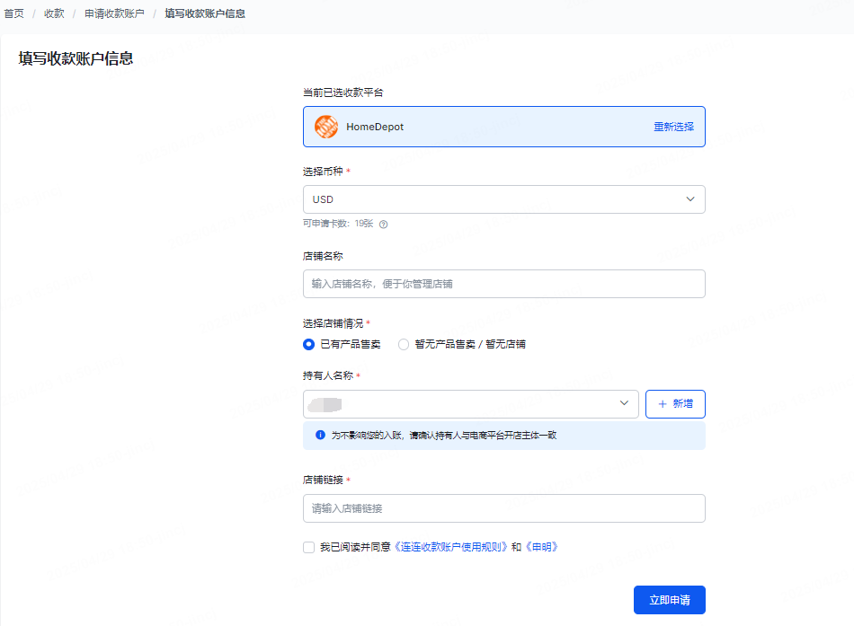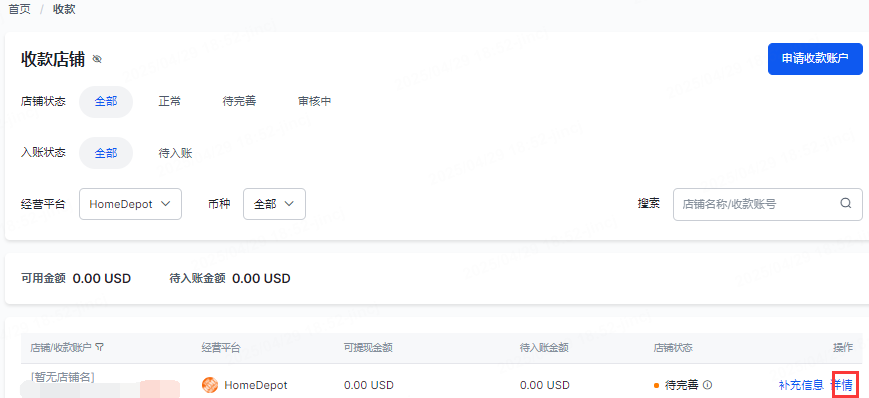 点击【收款】-选择对应的经营平台【HomeDepot】,点击【详情】,复制银行账户信息。