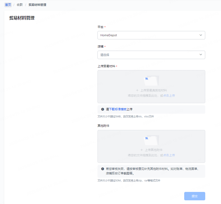 操作路径:连连官网-收款-贸易材料管理,选择平台、店铺。
