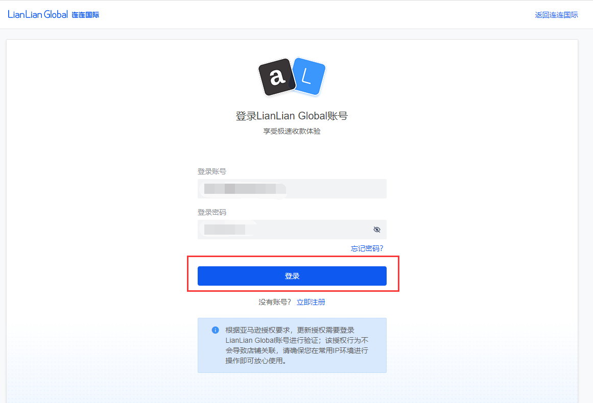 勾选方框后,点击右下角立即登录 LianLian Global 的账户