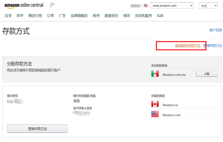 若您之前没有在Amazon后台添加过对应币种的收款账号,则直接点击【设置存款方式】,完成绑定操作
