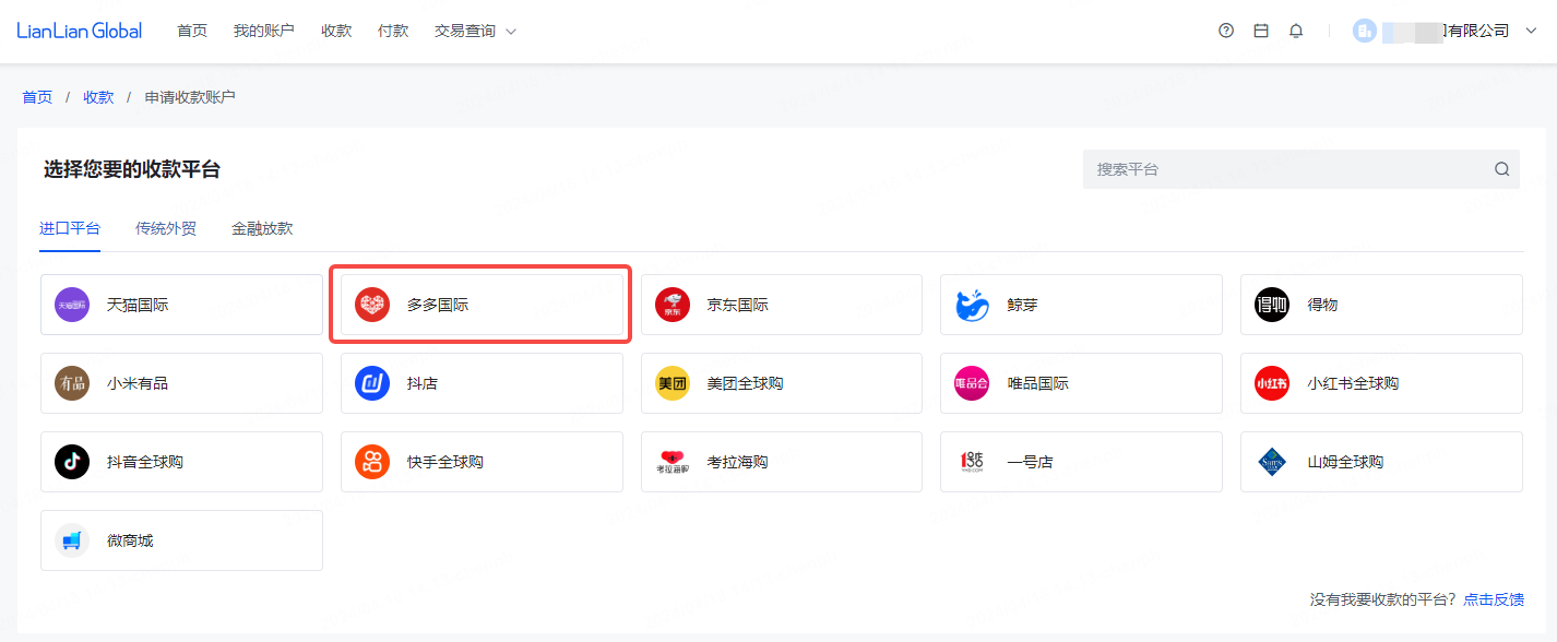 Step2:选择需要开通收款账户的电商平台-多多国际,并填写相应店铺信息:
