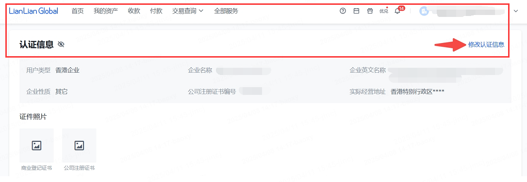 ③香港企业:香港企业用户自主更新证件,您可自行在【连连跨境电商收款-账号中心-认证信息-修改认证信息】中更新信息。