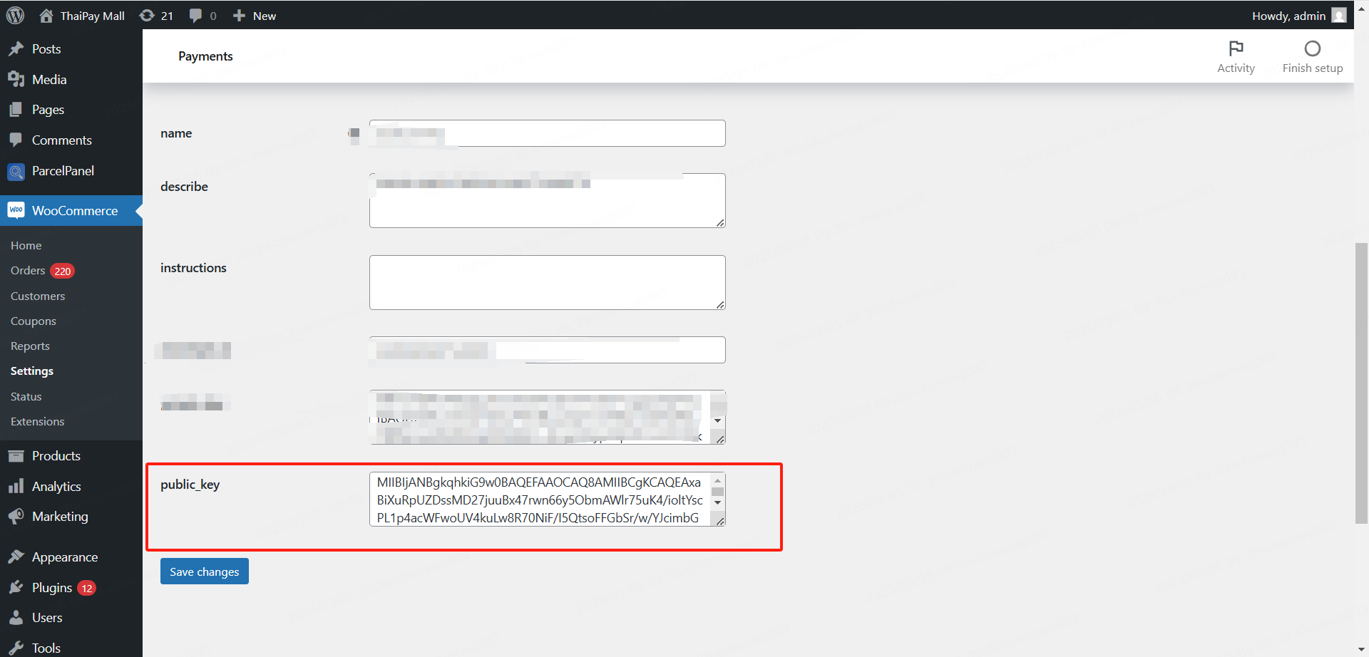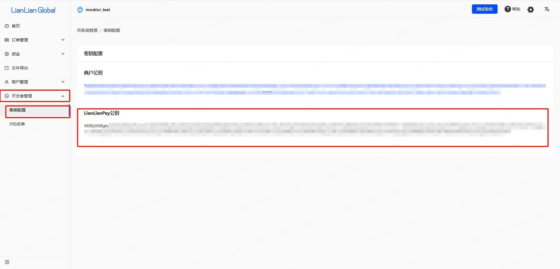 登录连连全球收单商户站后台,依次点击【开发者管理】-【密钥配置】,复制LianLianpay公钥,检查与WooComerce后台插件配置中public_key是否一致,若不一致进行替换