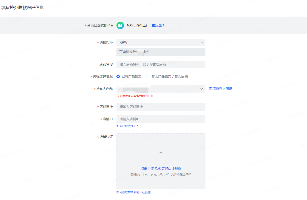 持有人名称: 只能选择韩国地区的持有人,请用韩文填写,与NAVER卖家注册主体保持一致。