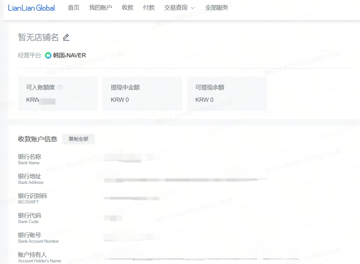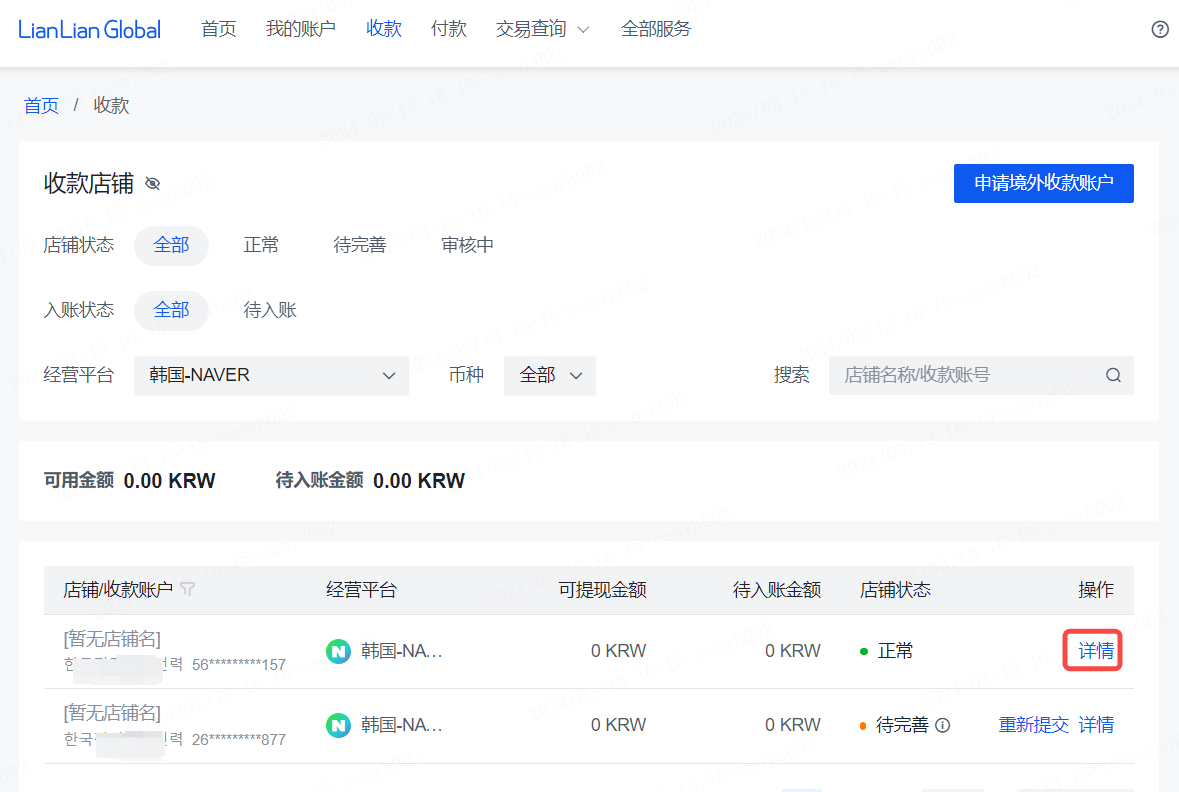 选择对应平台【韩国-NAVER(KRW)】后,点击【详情】查看收款账户