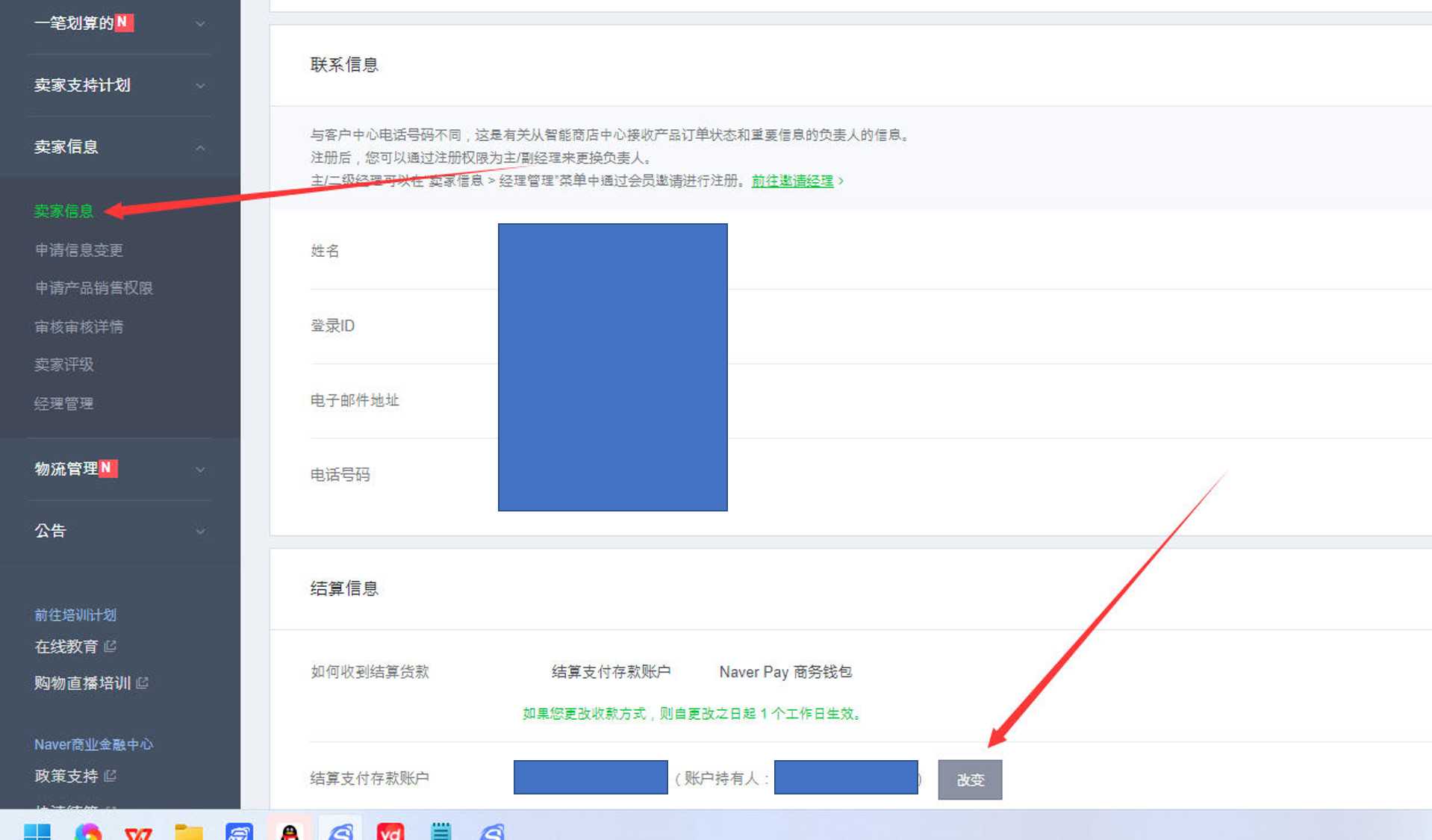 在NAVER后台更改收款账户: