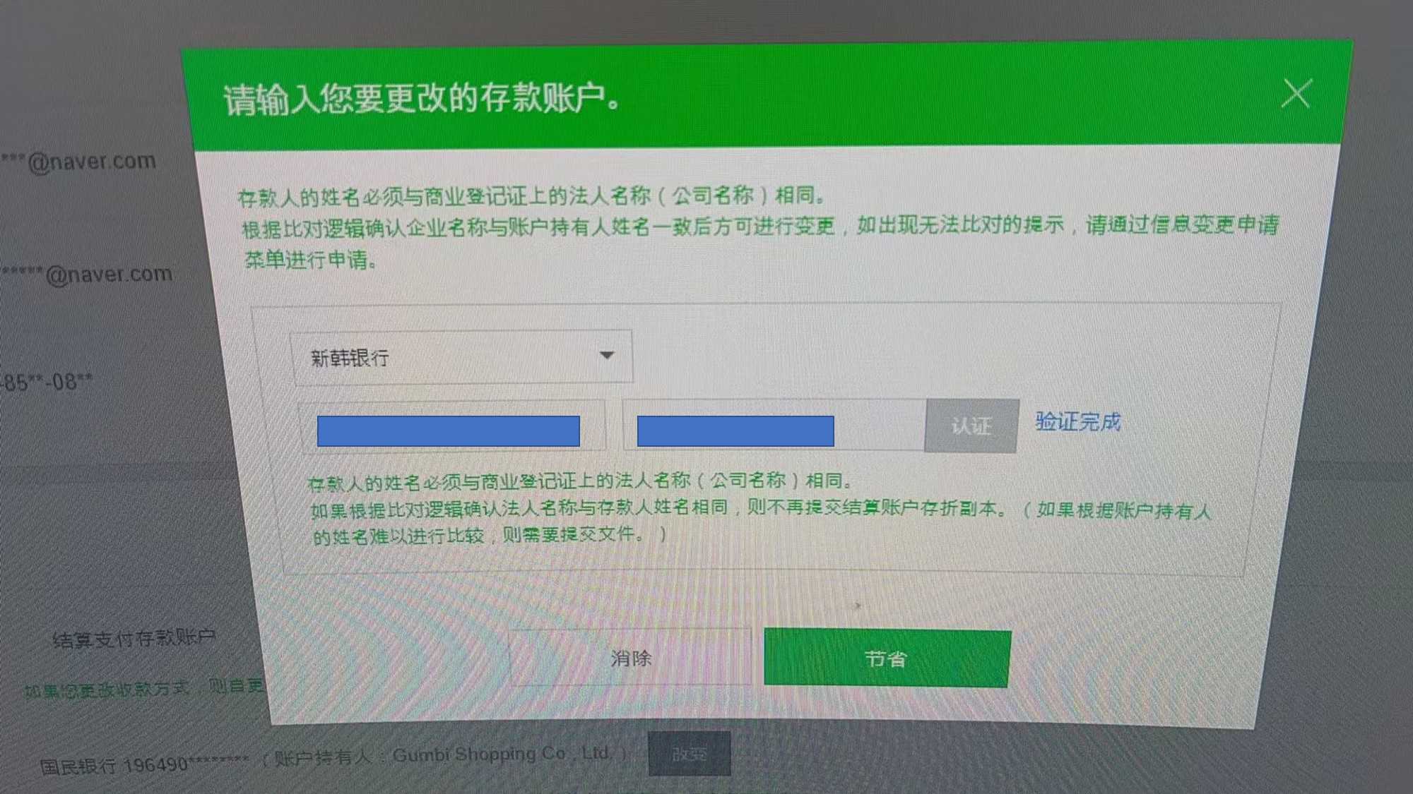 输入银行信息:新韩银行、填写存款人姓名和银行账号。请注意:存款人的姓名必须与商业登记证上的法人名称(公司名称)相同;填写后点击“认证”。