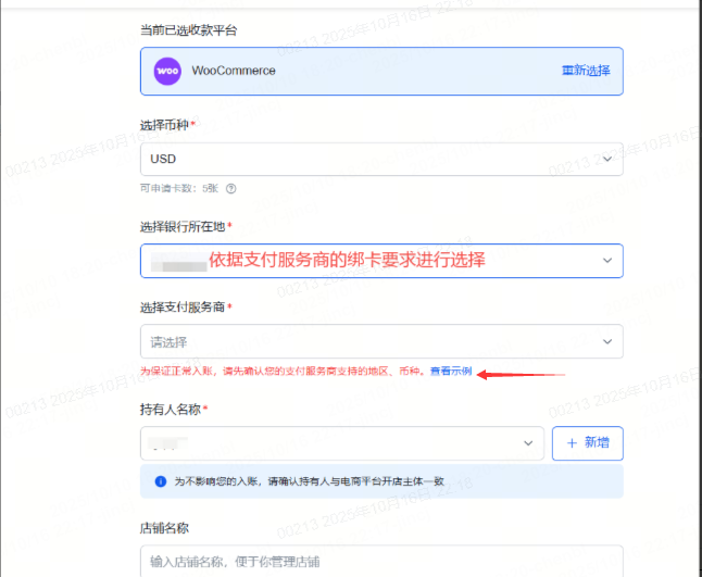 4.1 “选择银行所在地”、“选择支付服务商”:可点开蓝色超链接“查看示例”,查看部分支付服务商的绑卡要求。
