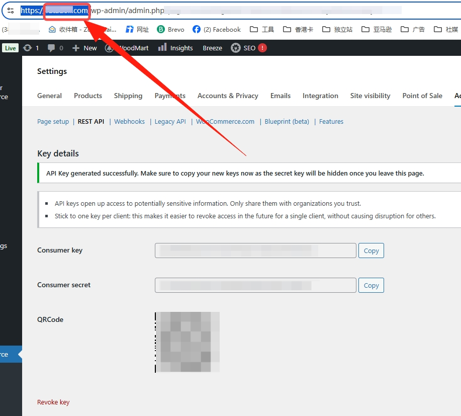 (4)密钥已生成(您应该会看到两个新密钥、一个二维码和一个“撤销 API 密钥”按钮)。请复制【Consumer key】和【Consumer Secret】分别填写至连连申卡页面的【Client Key】和【Secret Key】字段。