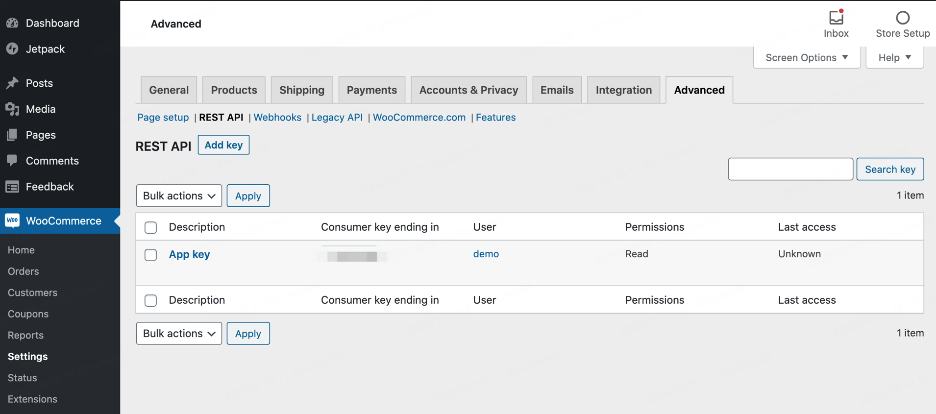 注意:在 WooCommerce 3.4版本之前,可以在 WooCommerce > 设置 > API > Key/Apps 中找到 Keys/Apps。