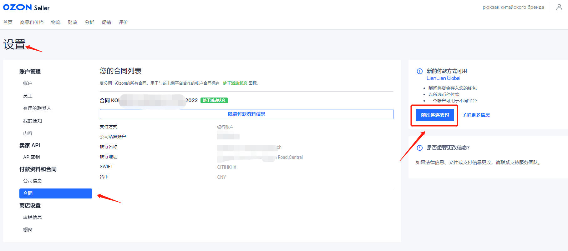 也可以登录Ozon后台查看是否已完成绑定。(登录Ozon卖家后台,找到【设置】-【合同】,看到已有连连支付,即绑定成功)