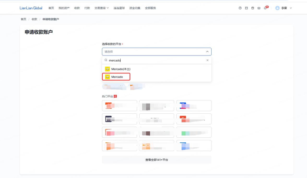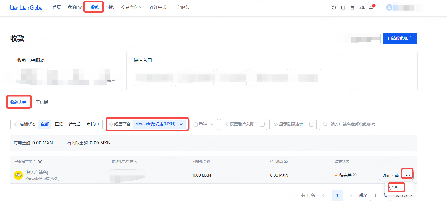 进入连连首页,点击【收款】,选择对应的经营平台【Mercado】后,可点击【详情】查看银行账号。