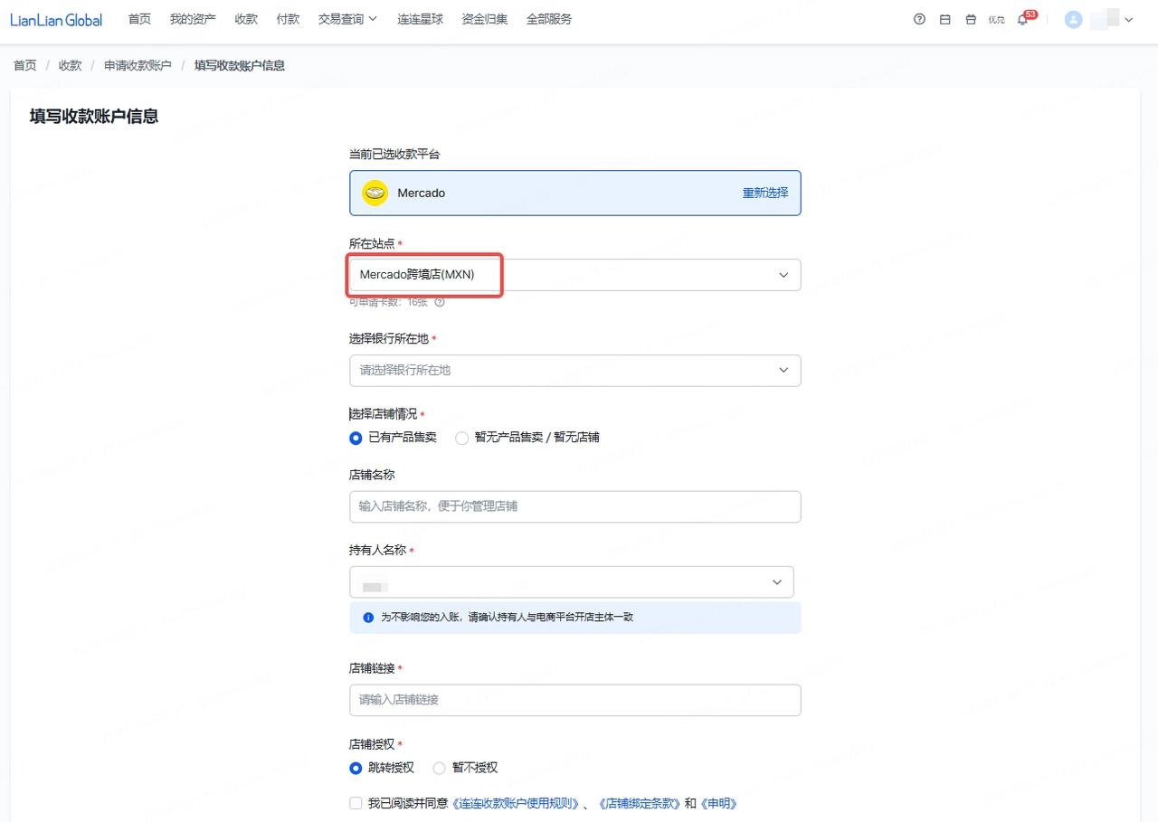 所在站点:填写【Mercado跨境店(MXN)】