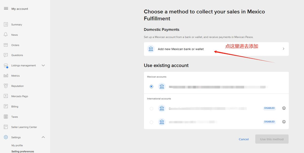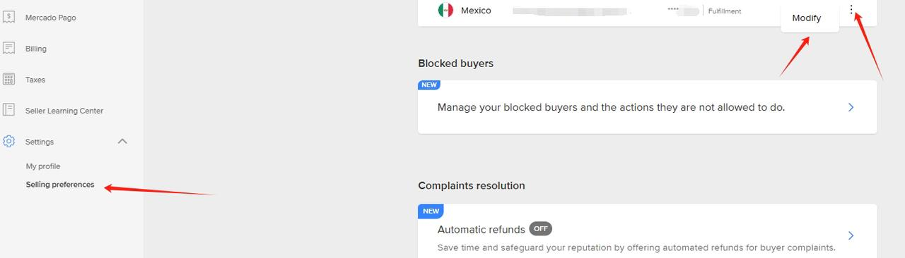 4.1、登录Mercado Libre卖家中心,点击【Settings】→【Selling preferences】,在Mexico站点右侧点击【Modify】修改绑卡息。
